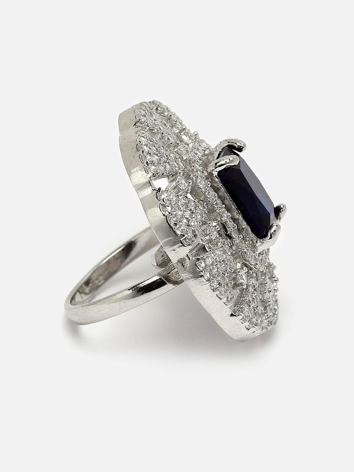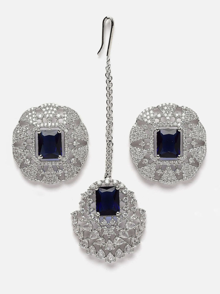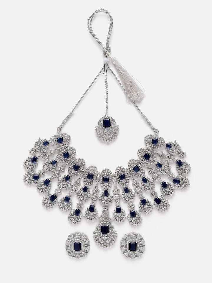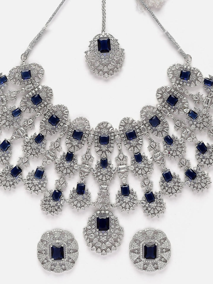Rhodium Plated Silver Blue Crystal Ad Bridal Necklace Mang Tikka Earrings Ring Set