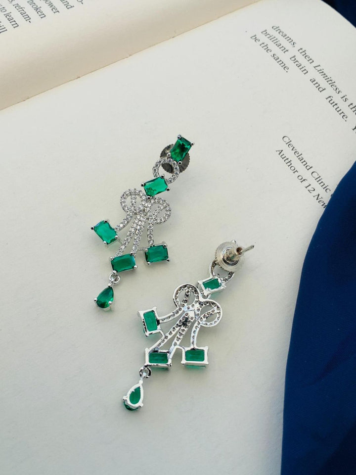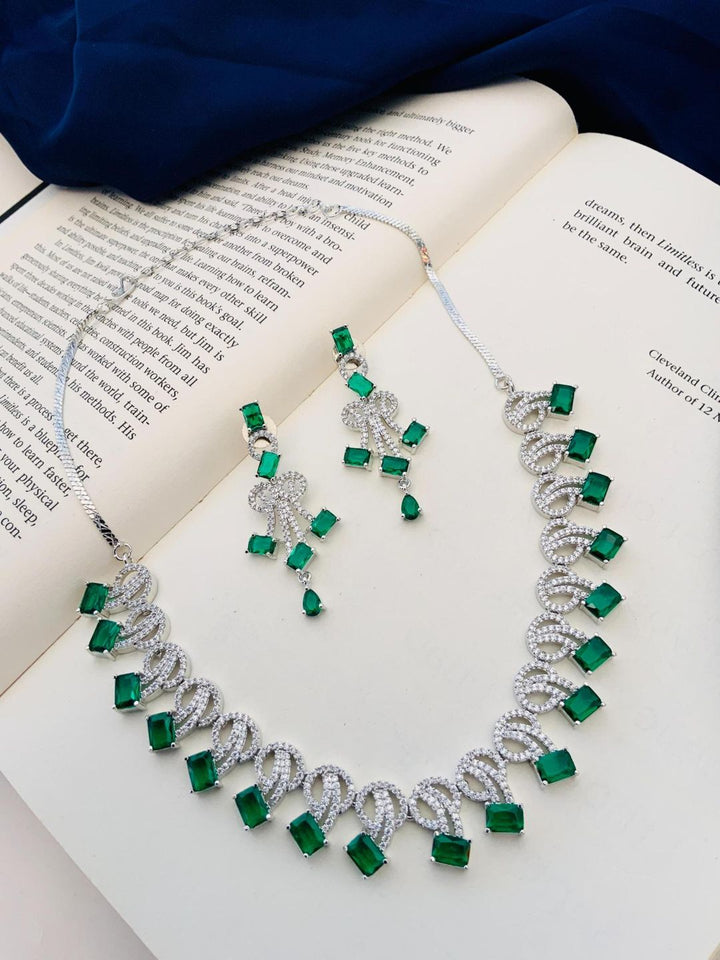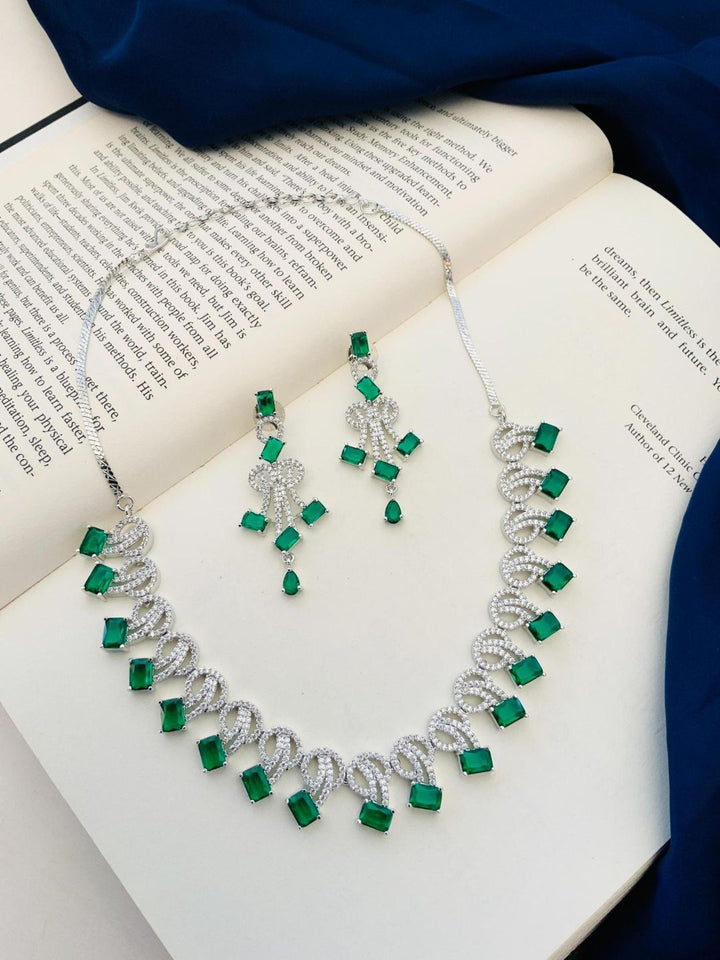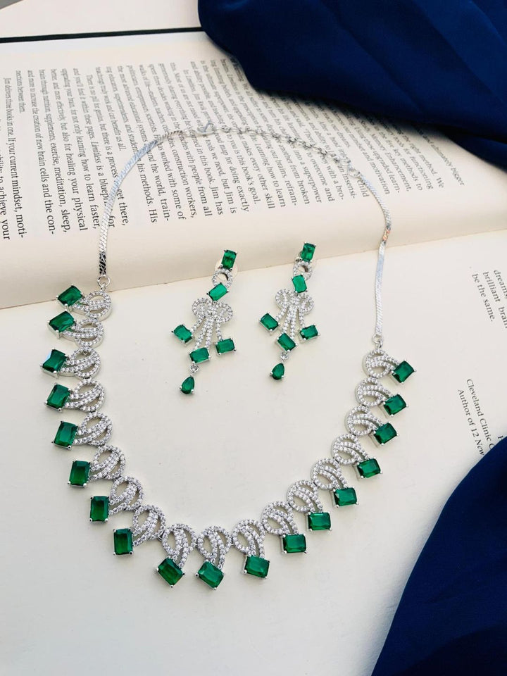 Sophisticated Silver Plated American Diamond Necklace Set - Green